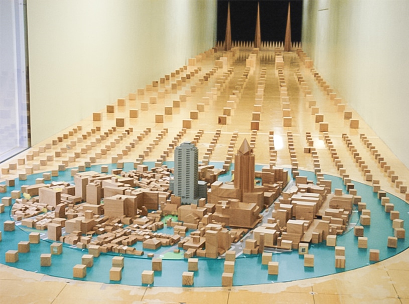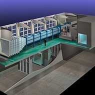 本風洞は、建築物等の模型に実際の市街地に吹く風を模擬した風をあて、建築物周辺の風の流れや強さ、作用する風圧力などを測定するための装置です。