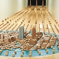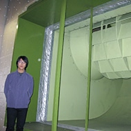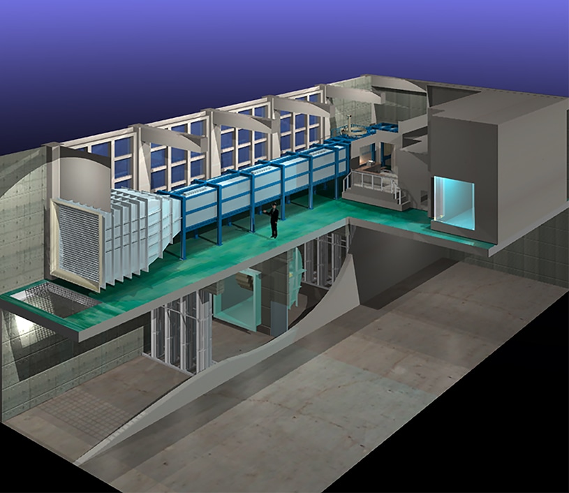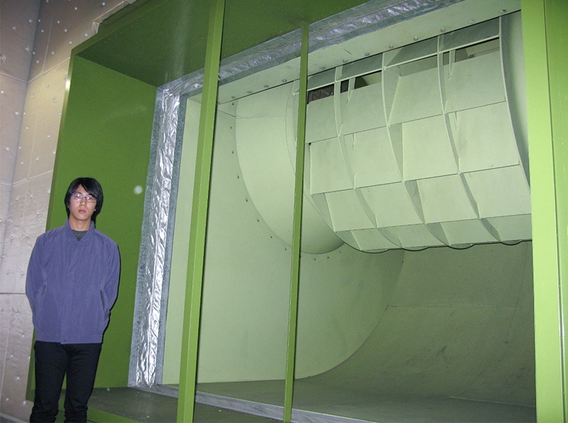 本風洞は、建築物等の模型に実際の市街地に吹く風を模擬した風をあて、建築物周辺の風の流れや強さ、作用する風圧力などを測定するための装置です。